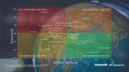 Stress and satisfaction do not have a neat correlation; it is not always the most stressed countries that are the least satisfied. This suggests that in some countries, low stress doesn’t mean satisfaction (for example Russia and Germany). It also suggests that the high stress levels seen in Argentina in Brazil do not lower job satisfaction.